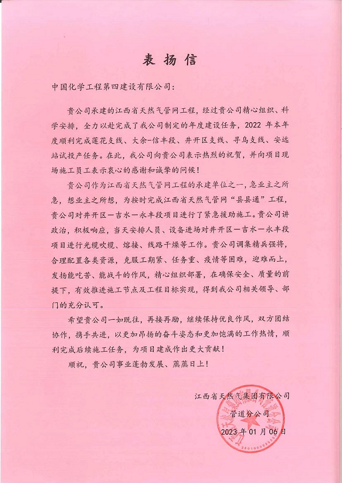表揚信中說,華北公司作為江西省天然氣管網工程的主要承建單位,講政治、求實效,積極響應業主要求,對井開區-吉水-永豐段進行光纜吹纜、熔接、線路干燥援助施工工作。華北公司調集精兵強將,合理配置各類資源,克服工期緊、任務難、疫情重等困難,有效推進施工節點及工程目標實現,得到業主的充分認可和稱贊。