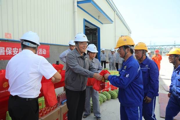 在項目現場,趙亮為一線建設者們送上了西瓜、涼茶、防曬物品等“清涼大禮包”,對他們的辛勤付出表示感謝,高度贊揚他們不畏高溫、愛崗敬業,為項目建設作出了積極貢獻,并囑咐他們在高溫天氣下作業要加強防護,做好防暑降溫工作,保障自身健康安全。同時,他強調,岳化新材料項目部要妥善安排好一線職工的生產生活,切實關心職工身體健康,確保職工在室內、室外的工作環境安全。