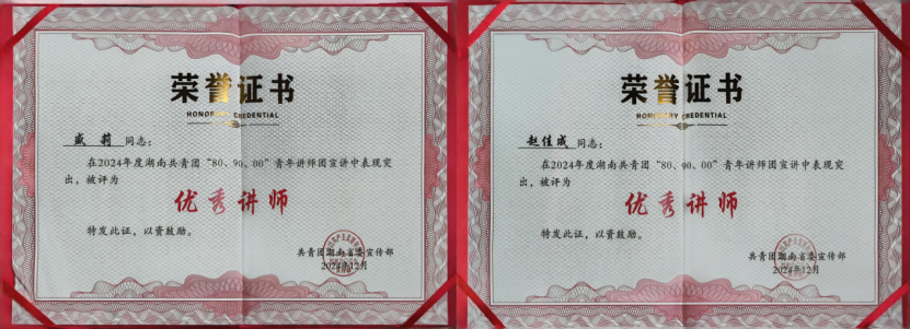 近日,共青團湖南省委召開“理 XIANG 青年”新時代湖湘青年理論學習年度示范宣講會。會上,公司青年盛莉、趙佳成榮獲“湖南省2024年度優秀講師”稱號。