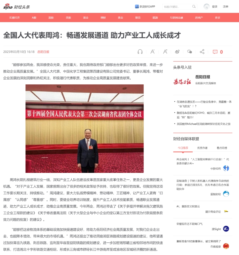 3月10日,岳陽日報·岳陽發(fā)布微信公眾號以“全國人大代表周鴻:暢通發(fā)展通道 助力產業(yè)工人成長成才”為題報道周鴻參加2025年全國兩會。