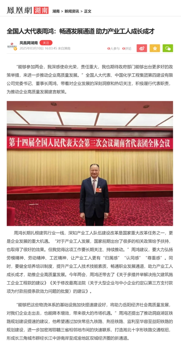 2025年全國兩會期間,全國人大代表,中國化學四化建黨委書記、董事長周鴻向大會提交《關于加強產業(yè)工人隊伍建設的建議》《關于多措并舉解決拖欠建筑施工企業(yè)工程款的建議》《關于推動洞庭湖區(qū)常岳九鐵路、荊岳鐵路、監(jiān)利至華容至益陽鐵路規(guī)劃建設提速的建議》《關于修改最高法院〈關于大型企業(yè)與中小企業(yè)約定以第三方支付款項為付款前提條款效力問題的批復〉的建議》等4條建議,受到主流媒體深入報道,引起社會各界廣泛關注。